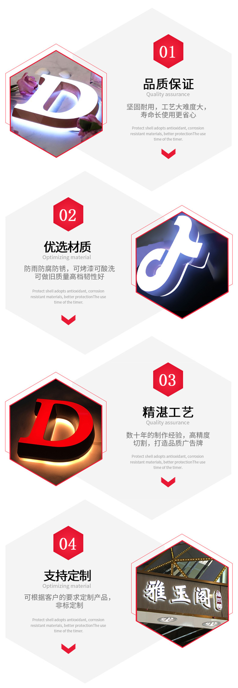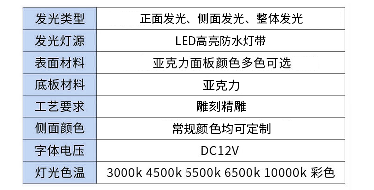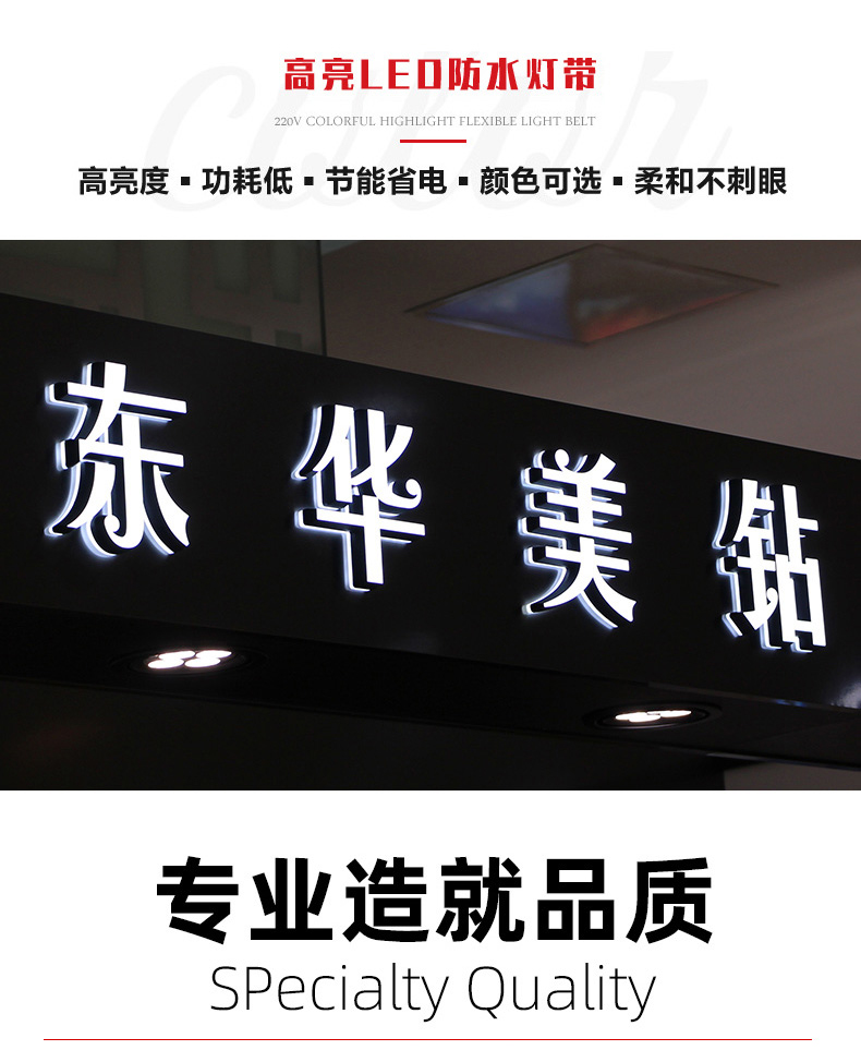 发光均匀无暗影、亮度好,颜色纯正字边和字面质色可任意搭配(可UV打印贴不干胶/亚克力不锈钢/浇灌树脂)同时可做多种发光效果