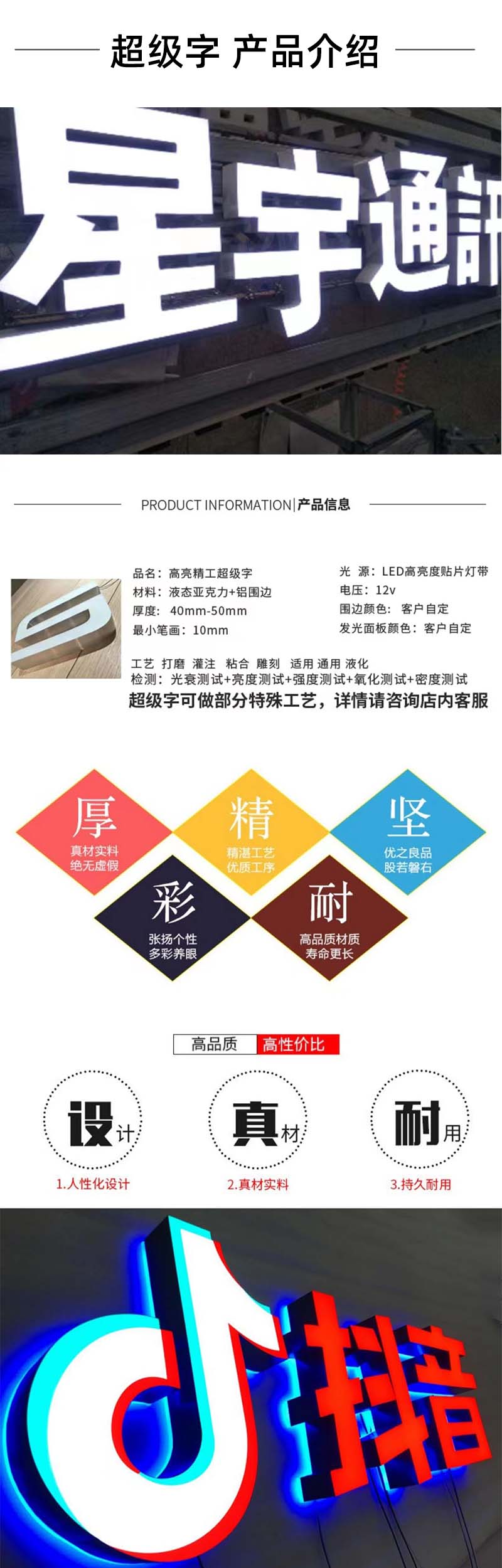 高品质新型材料,轻薄质感,时尚大方边缘光滑,无缝一体化,精致美观,尽显独特,耐冷耐热,坚固细腻,环保美观,户外不发黄,不开裂,环保耐用。适用于所有户外门头招牌