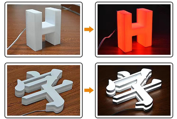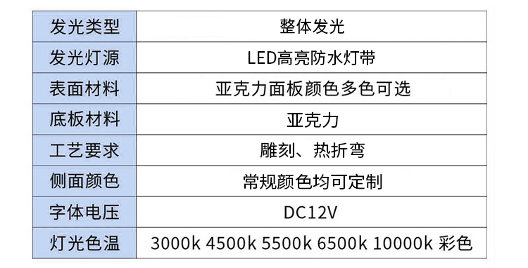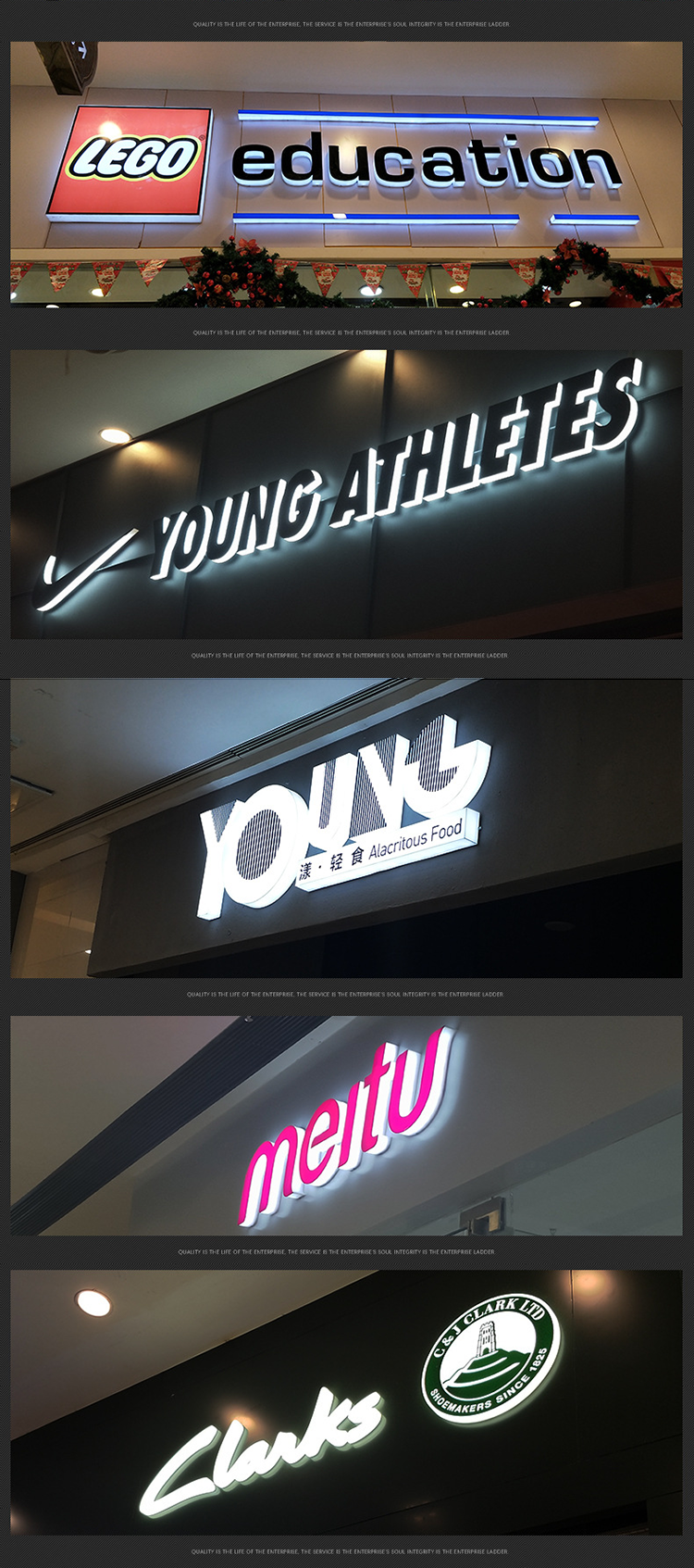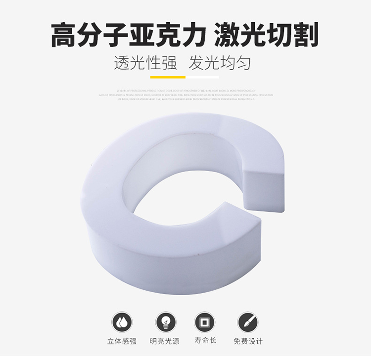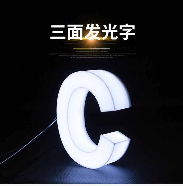 通体发光字使用的寿命比较长,节省维护费用;灯抗冲击、耐酸碱、强度高;字体可以发出五颜六色光芒,色彩可以任意改变,字迹清晰、真实感强,不易出现缺笔少划的现象