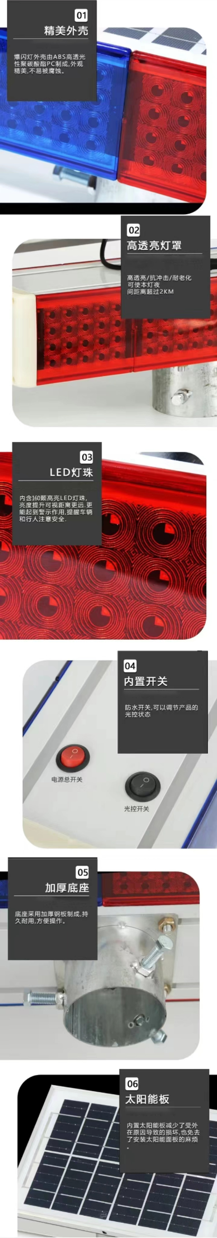 太阳能爆闪灯是一种特殊的警示灯具,通常用于交通安全、施工现场、道路障碍等场合,以提醒行人和车辆注意安全。这种灯具一般采用LED光源,具有高亮度、低能耗、寿命长等优点