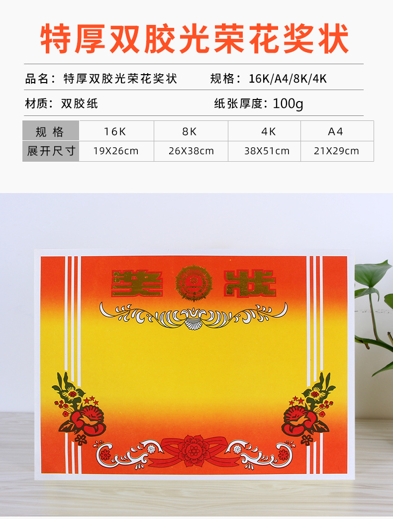 (双胶纸)特厚光荣花奖状