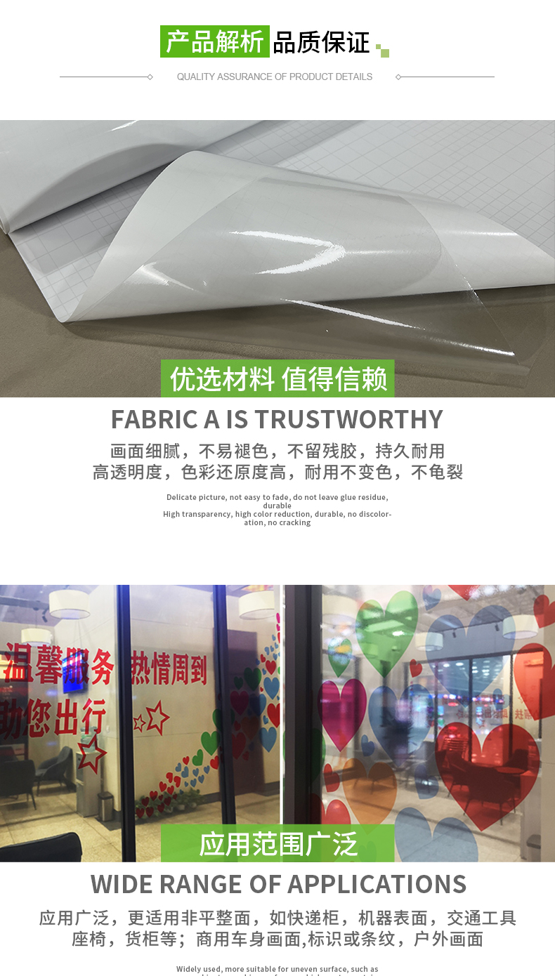 色彩还原、洁白光滑、抗拉性强、规格齐全、适用各种广告,写真、适用于车身广告、玻璃幕墙、品质保障、急速发货