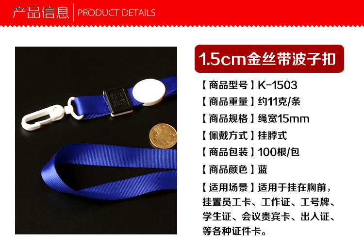 (K-1503)波子扣+蓝带白珍珠纹科记绳带(波子扣)(吊绳/挂绳)