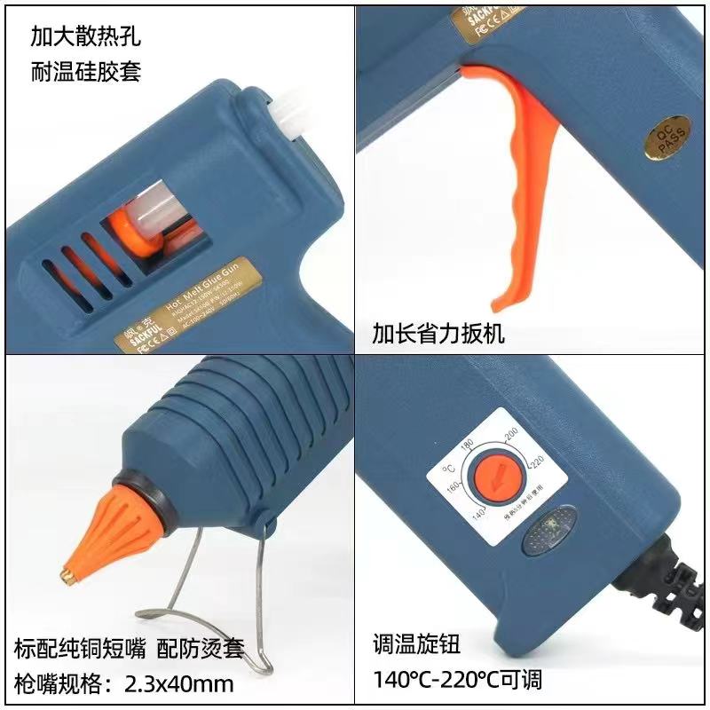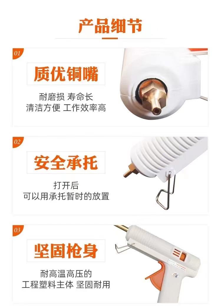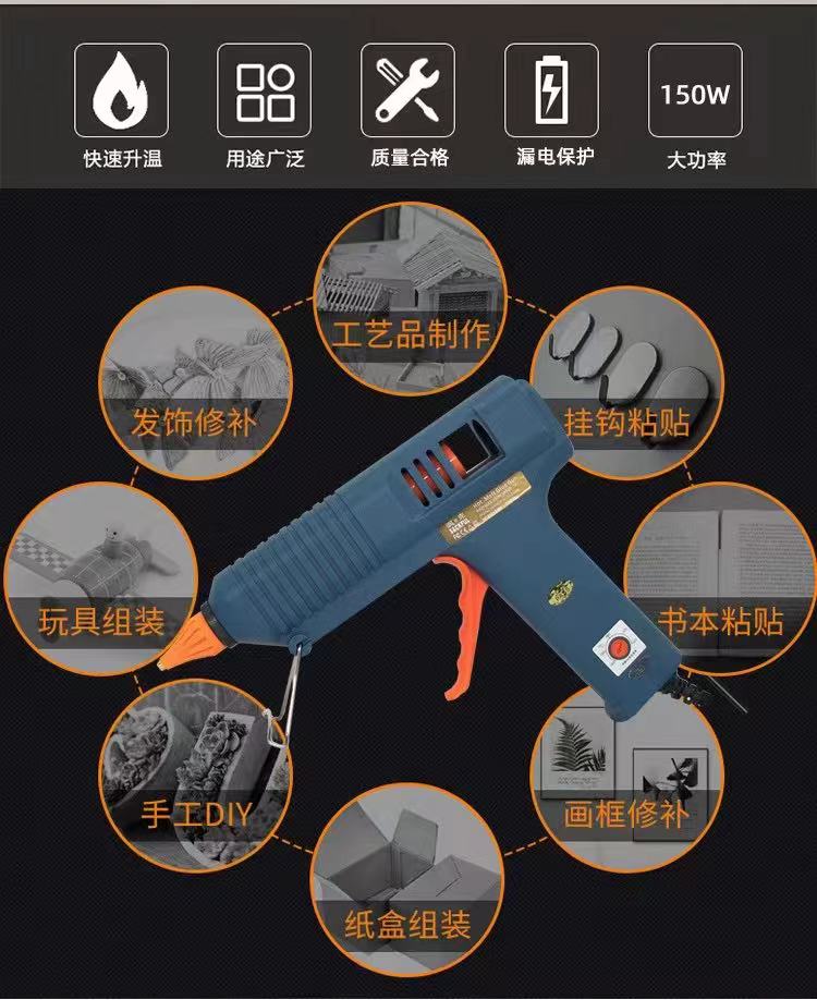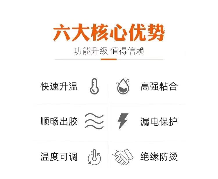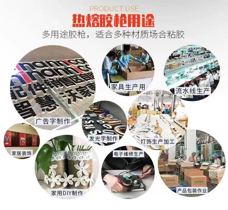 热熔胶枪可以用于各种基材的粘接如金属制品、木制品、塑料制品、纸制品、皮革制品和陶瓷制品等,通过精确控制热熔胶的温度和施加的压力,使最终的粘合成品牢度更高