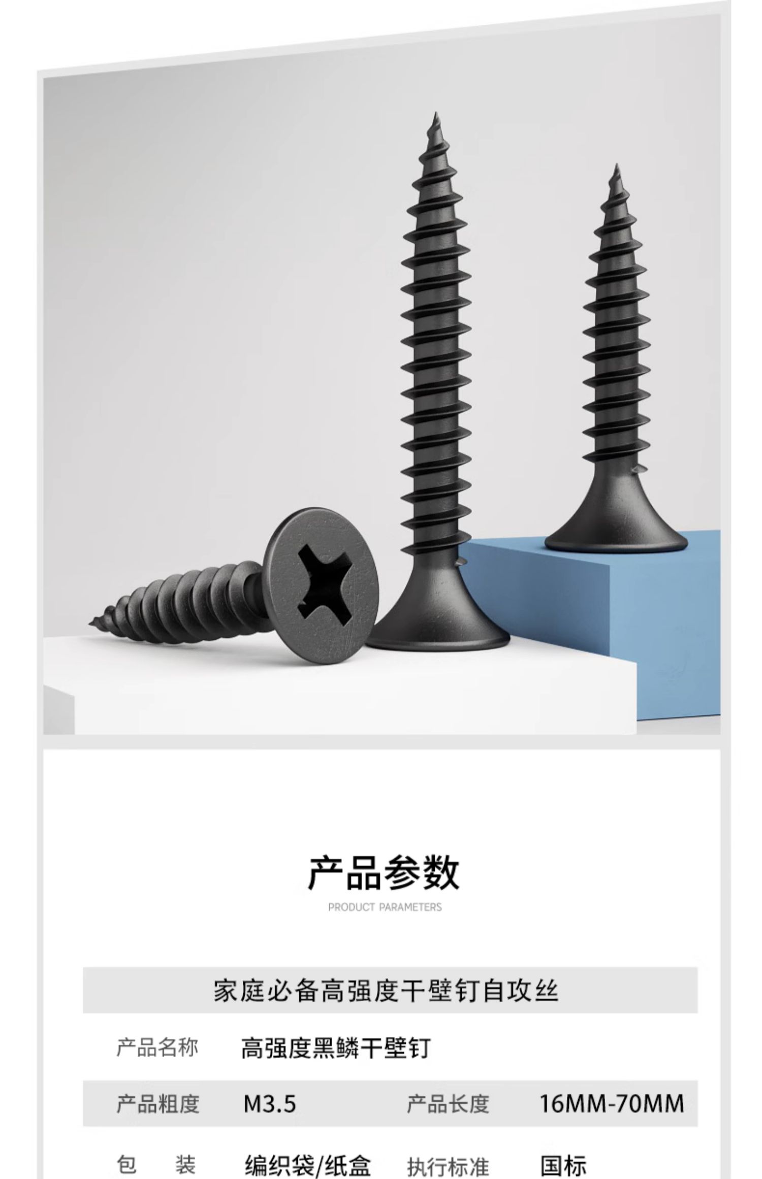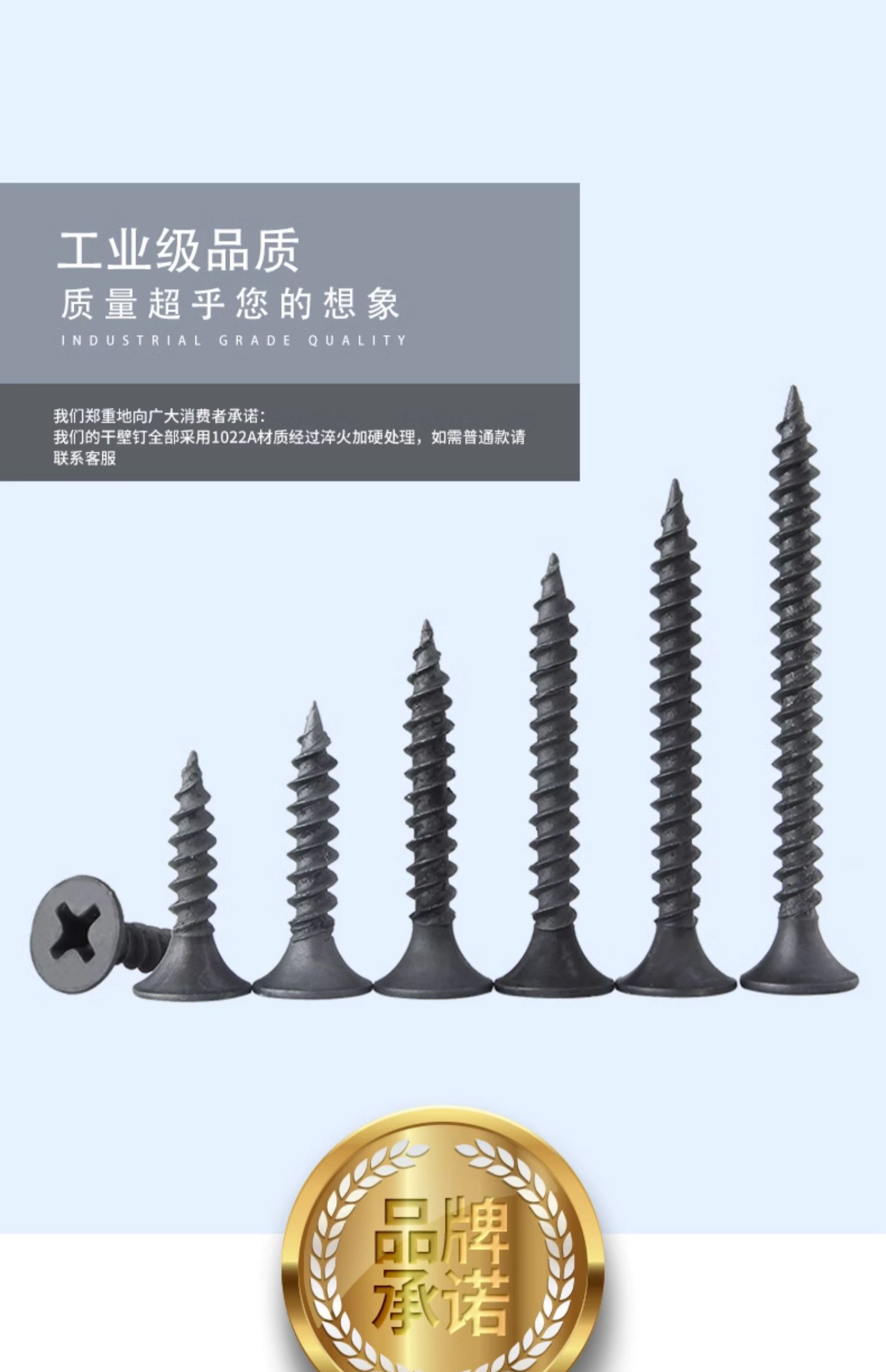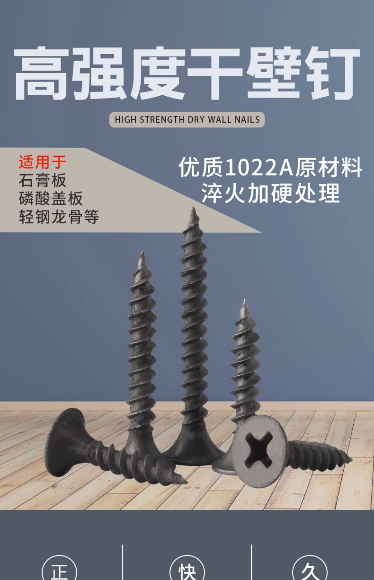 黑色磷化高强度干壁钉是一种紧固件,通常用于连接和固定各种材料,如金属、木材、塑料等,广泛应用于建筑、家具、电器等领域
