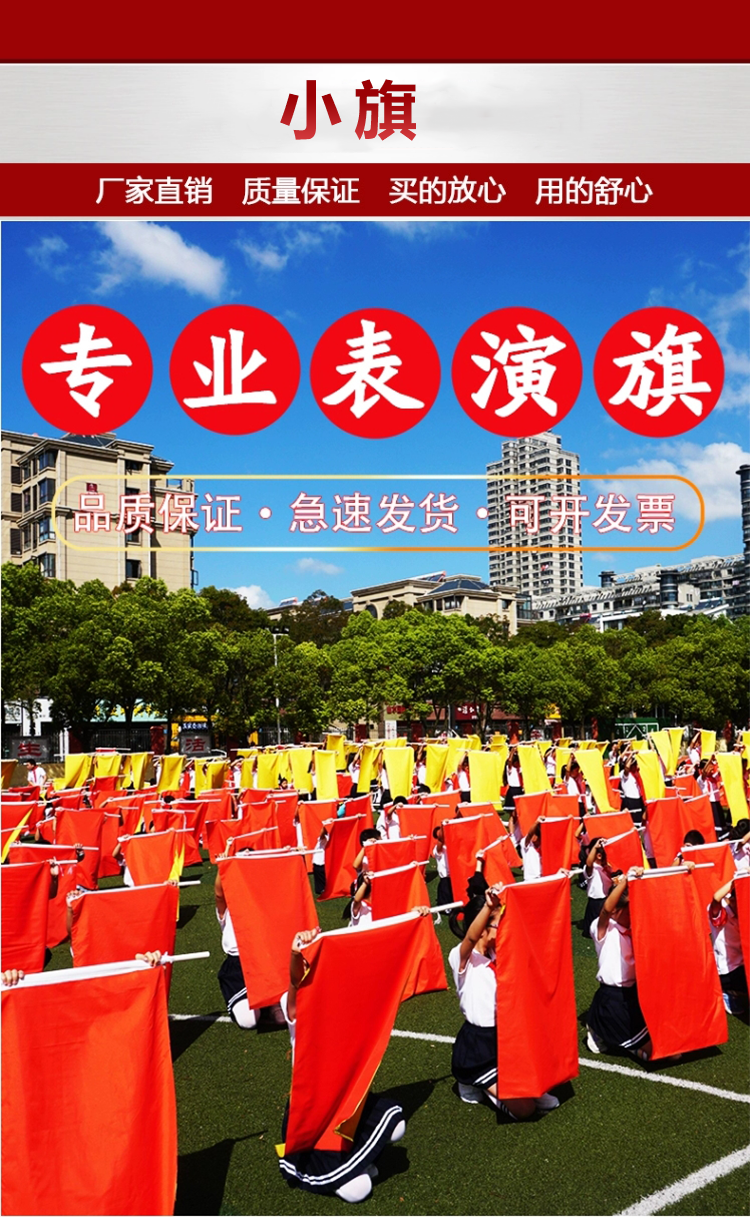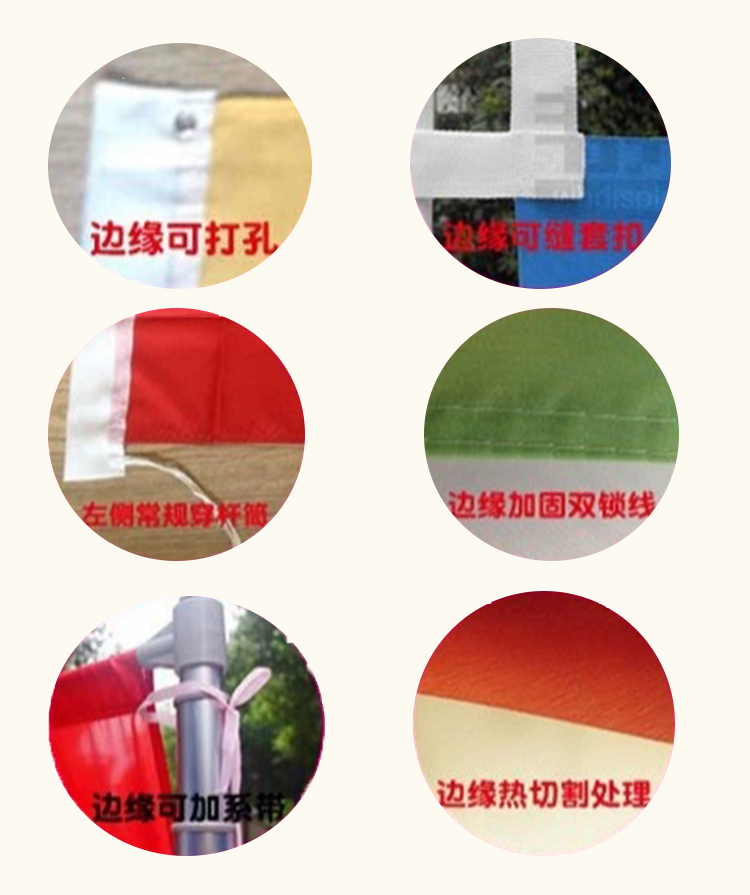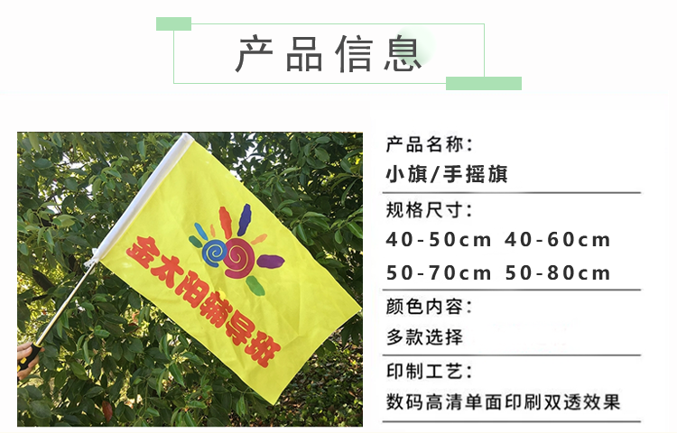 小旗防水防晒,色泽亮丽,多款选择,高温切刀切边,不起毛边,不易抽丝,高弹旗杆,挥舞自如,品质保障