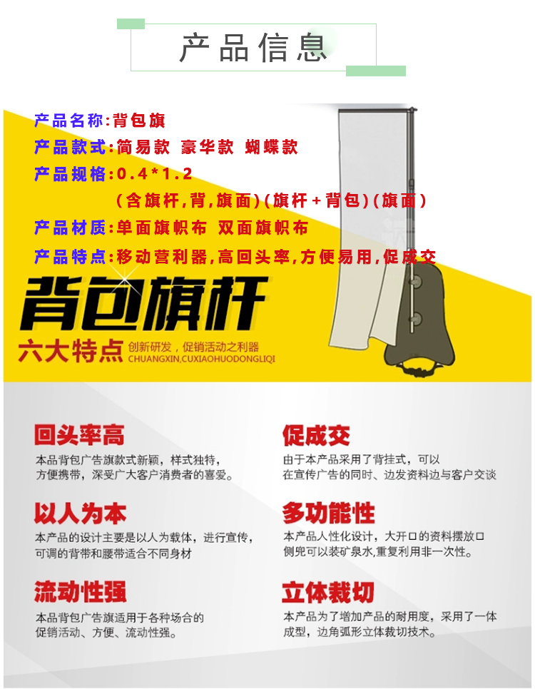 旗杆采用铝合金固定,可自由伸缩;储物空间大,使用方便流动性强,结实耐用,拆装简单,品质保障,极速发货